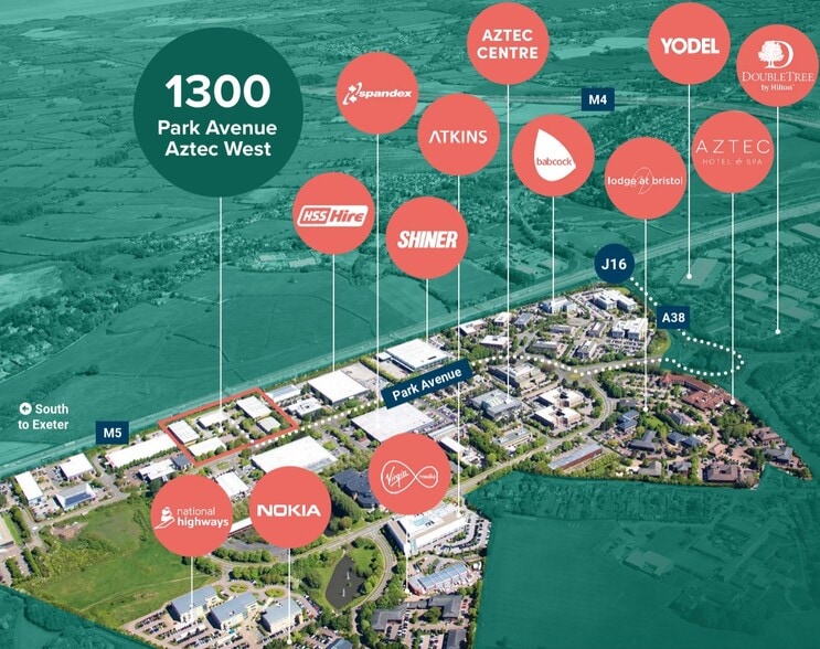 The industrial units are of steel portal frame construction with brick and profiled steel clad elevations under profiled steel clad roofs with integrated roof lights. Typically these modern, terraced units benefit from designated loading areas and generous car parking. Internally, the units provide a range of eaves heights of between 5.80m and 6.20m and house both ground and first floor office accommodation. Aztec West is the South West’s most prominent and high profile business park location, it benefits from a highly prominent strategic situation, lying adjacent to J.16 of the M5 and 1 mile South of the M4/M5 interchange, which provides links to the national motorway network. The A38 also links directly to the park providing a route to the city centre approximately 8 miles to the south.
