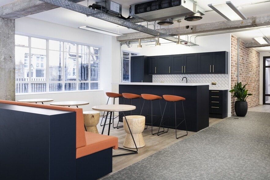 Beyond Kingsbourne House offers 7 floors of contemporary workspace design infused with natural light, brickwork, biophilic features and a palette of colourful themes that will fuel creativity or nurture a calm mindset. An open air roof terrace gives awe inspiring views, providing a space to socialise, network or take a moment to breathe for quiet contemplation.