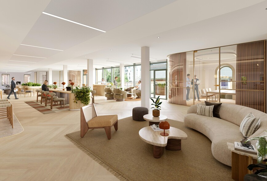 Business Lounge Outstanding, bright, open-plan office space finished to an exceptional standard, featuring upper-floor balconies and an external ground-floor terrace.