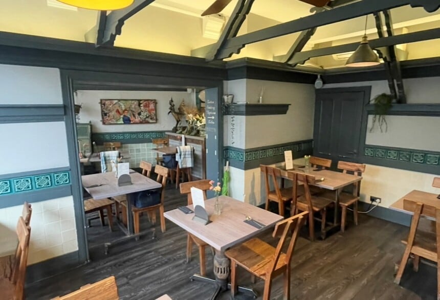 The property comprises a two-storey restaurant premises with a prominent glazed frontage, providing excellent natural light and visibility. The ground floor offers a well-configured dining area accommodating approximately 30 covers and benefits from wood-effect laminate flooring, ceiling fans, spot lighting, wall-mounted power sockets and air conditioning. Additional features include a small service bar, two storage rooms, customer WC facilities, and painted and plastered walls complemented by decorative tiled finishes. To the rear of the ground floor is a fully fitted commercial kitchen, equipped with industry-standard non-slip flooring and extraction systems, providing a practical, efficient and compliant workspace for food preparation. The first floor provides further dining accommodation for approximately 28 covers and features single-glazed, timber-framed windows with frosted and stained-glass detailing. This level also includes additional customer WC facilities, a dumb waiter and a generously sized storage room.