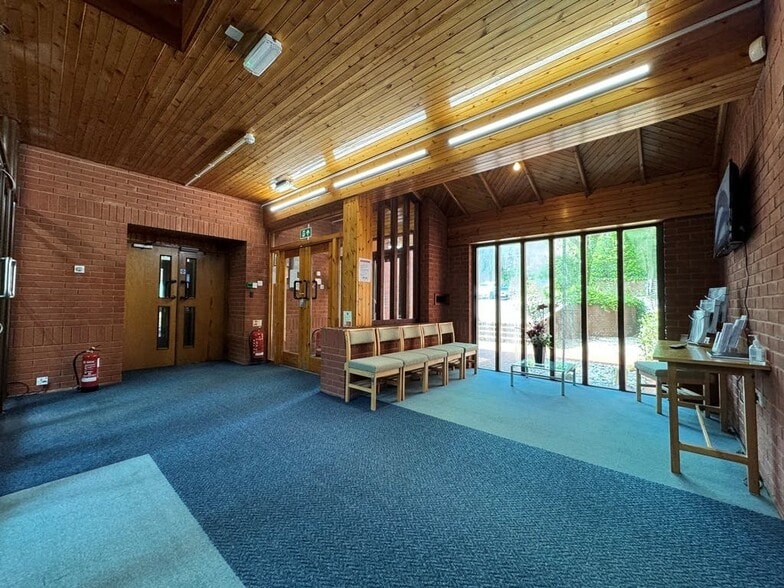 Link House is a detached office building set within 0.65 acre site including car park surrounded by trees. The building comprises two storeys split into north and south wings with communal central core/entrance.