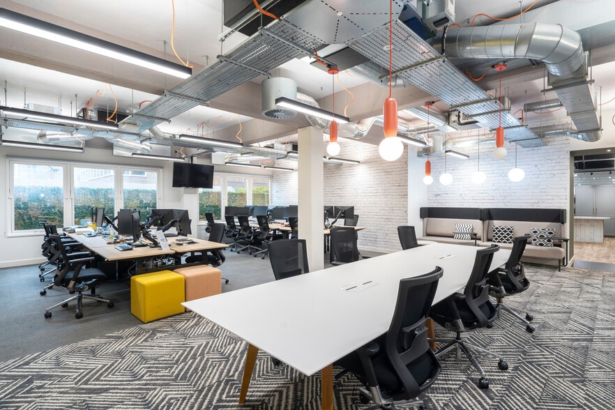 Behind a retained façade, the building provides well-configured, open-plan workspace with excellent natural light, high ceilings and industrial design accents. The available ground and first floor benefits from a high-quality fit-out, including exposed services, modern lights and fully integrated kitchen facilities, creating an ideal environment for creative, tech and professional occupiers.