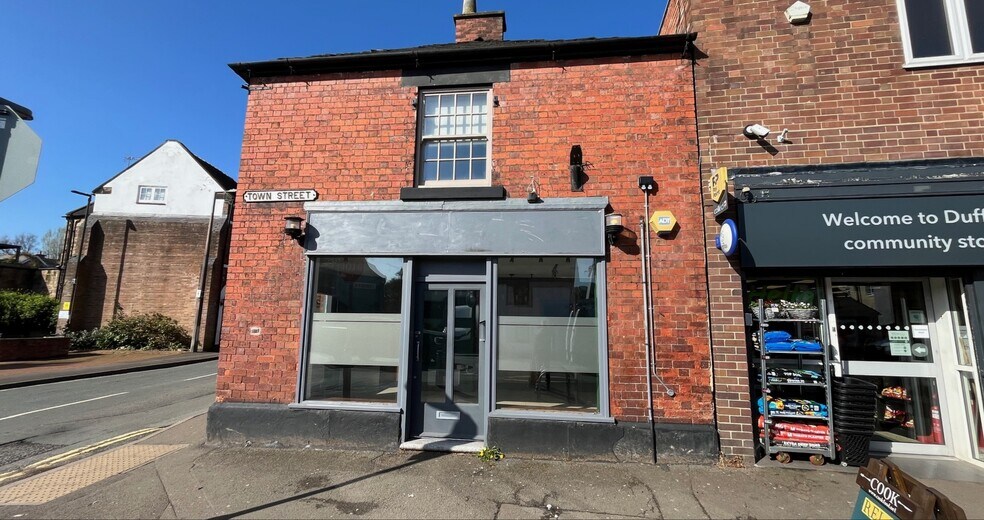 The property comprises a ground floor retail unit within a larger two storey brick building beneath a pitched slate roof.The subject property occupies a prominent position on the west side of Town Street adjacent to the Co-Operative convenience store.