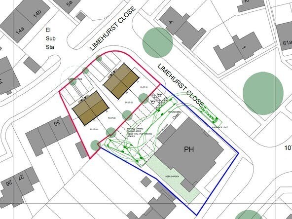 The property occupies a site of approximately 0.21 acres (0.085 hectares), with the pub building positioned toward the south-east corner. Car parking is located to the north west of the site and is accessed via Limehurst Close. The development land proposed is at the very northern end of the site, where there are some excess car parking spaces, not required by the pub to operate successfully.