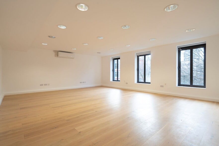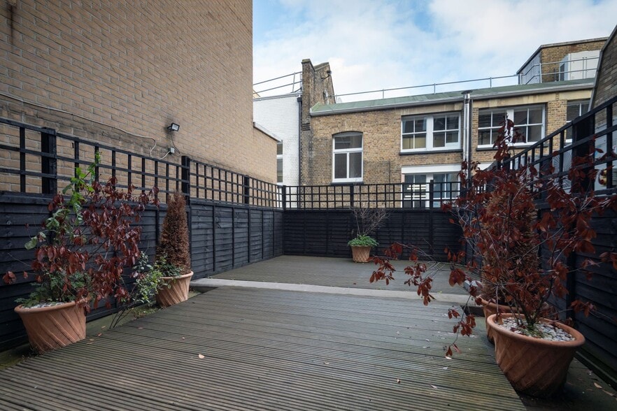 The 3rd floor provides 840 sq ft of bright, open-plan space with wooden flooring, air conditioning, and a fitted kitchen. A standout feature is the exceptionally large private terrace at the rear, perfect for outdoor meetings or breaks. Available on a 2-year lease (block date June 2028).