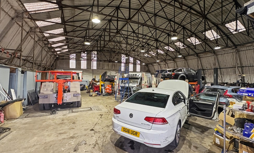 The property comprises a detached light industrial/workshop unit of steel portal frame construction, with profile metal sheet cladding to the elevations and roof. The lower sections of the external walls are formed in concrete blockwork. The unit is accessed via a large roller shutter door to the front elevation, opening into a predominantly open-plan workshop area. Internally, the accommodation provides a generous clear working height with an arched roof structure supported on exposed steel trusses. Roof lighting is provided by intermittent translucent roof panels, supplemented by high-bay electric strip lighting. The internal space is primarily utilitarian in nature and is suitable for a range of light industrial, storage, or vehicle-related uses, subject to the necessary consents. A small ancillary block is positioned within the unit, providing basic office/storage accommodation. The workshop floor is of concrete finish and appears suitable for heavy-duty operational use, with evidence of vehicle maintenance activity. Externally, the property benefits from a substantial forecourt and yard area, providing on-site parking and circulation space. The site is secured by palisade fencing and gated access, with a mix of concrete and compacted hardstanding surfaces. Overall, the unit represents a functional industrial building of older style construction, offering versatile accommodation with external yard provision within an established commercial setting.