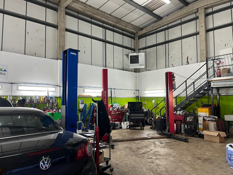 Industrial unit with roller shutter door, which includes a 127 sq ft / 11.9 sq m mezzanine. Previously used as a vehicle repair workshop. Secure yard/car parking, totaling 3,924 sq ft / 364.5 sq m.