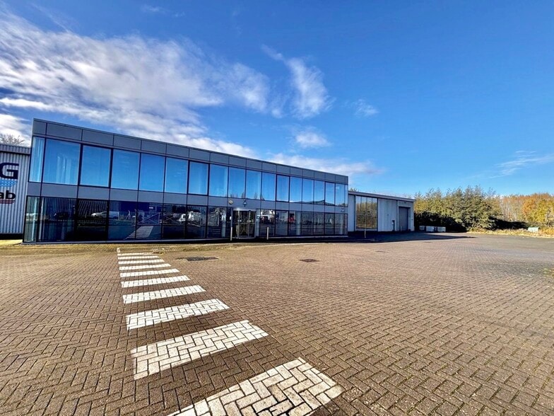 To the front of the property is a two-storey office block, containing meeting rooms, welfare facilities and utility/server rooms. There are suspended ceilings, air conditioning and raised floor boxes throughout. There is fibre broadband to the site and CCTV throughout including the site perimeters. The front portion of the offices is separately metered and therefore capable of being independently occupied. The warehouse is open-plan with acoustic cladding, modern LED lighting and benefits from a 300kVA 3-phase power supply. To the front of the property are two sectional overhead doors for loading. There is a minimum eaves height of 6.12 m, rising to 7.81 m at the apex. Externally there is space to park approximately 32 cars in the designated parking area, leaving space for turning and loading. The warehouse is sold with a total site area of 2.61 acres and benefits from a low density site cover of approximately 24%. £2,350,000 for the freehold or £200,000 per annum exclusive for lease, on terms to be agreed.