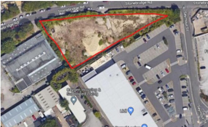 The land comprises an undeveloped hoarded site on the border of a residential area. Permitted Use: Planning required/ The site is positioned behind a busy supermarket