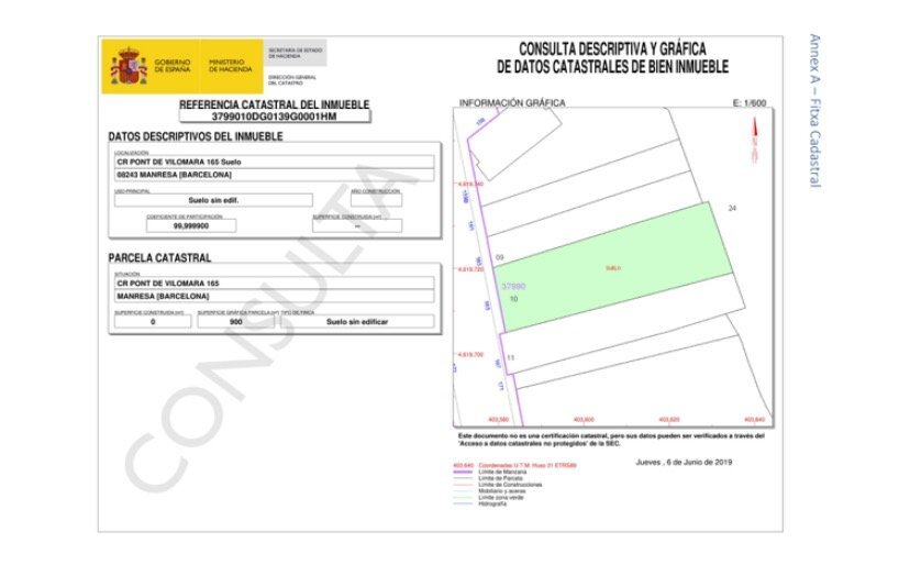 Urban land on the Carretera del Pont de Vilomara, Manresa, has 1,442 m2 and allows the construction of between 8 and 10 houses, in addition to 356 m2 for commercial use. It is located next to Mercadona and the Dia supermarket. Communications are excellent, with bus lines nearby and the Manresa train station connecting with Barcelona and other towns. In addition, it has easy access to the C-55, C-16 and C-25 roads, facilitating the connection with Barcelona, the Pyrenees, Girona and Lleida.