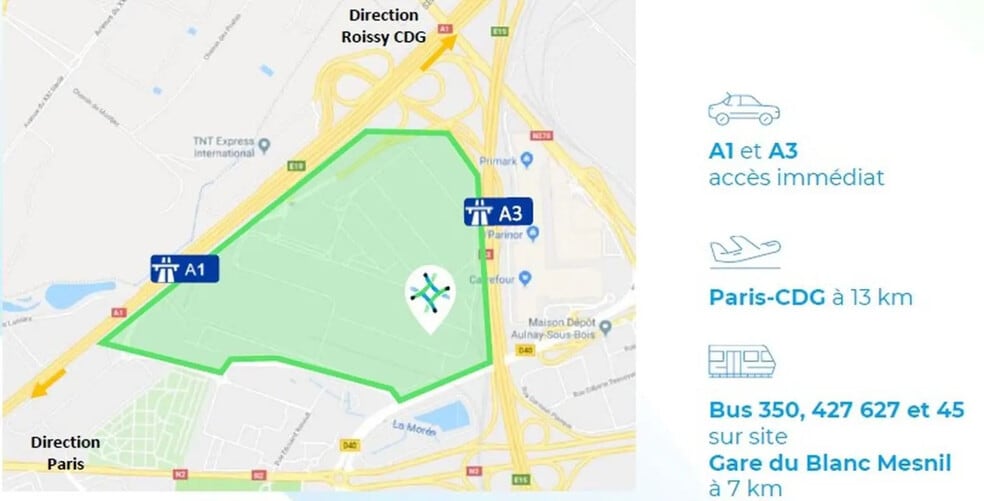 RG Conseil vous propose à la location, en bail dérogatoire, un entrepôt de 1400 m² environ, situé à Garonor, Aulnay sous Bois, équipé de 14 quais et un plain pied, avec une hauteur libre de 9,50, et une résistance au sol de 5T au m², disponible immédiatement, Brasserie et hôtels à proximité Accès camions Accès camionnettes Accès poids lourds Pré-câblage informatique et téléphonique PC de sécurité Détection incendie Escalier intérieur Sol : dalle béton Structure : bardage double peau Structure : sipporex . Accès véhicules légers . Accès poids lourds . Aire de manoeuvre . Aire de chargement . Charge au sol : 5 tonnes / m² . Hauteur libre : 9,50 m . Rampe de plain pied : 1 . Quai : 14 . Sanitaires Surface RDC : 1075 m² Haut. libre max. ss poutre : 9,5 m Résistance sol : 5 T/m² Nbr de portes à quai : 14 Nbr de portes plain pied : 1 ICPE : Autorisations : 1510 Ossature : Béton Murs périmétriques : Double bardage Couverture : Bac acier Situation/Transports : Bus Garonor - Porte Sud (350, N42, 616, 247) Grand Paris Express Le Blanc-Mesnil (L16 Mi 2027) A 1, A 3 (Entrée), A 1, A 3 (Sortie) Borne de recharge Freshmile France/VQODSEY6PD (Bornes de recharge) Dépot de garantie : 3 mois de loyer HT/HC
