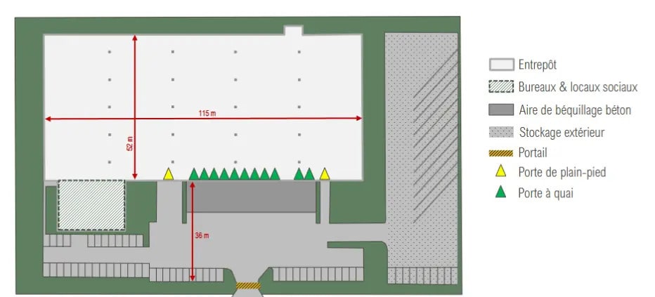 Entrepôts de qualité à louer à Goussainville, comprenant 11 portes à quai, 2 portes de plain-pied, résistance au sol de 3T/m², sur un site clos et indépendant. Opportunité idéale pour votre activité logistique. Bureaux : - accueil - open space - éclairage LED - locaux sociaux Entrepôts : - 6,5m de hauteur sous poutre minimum - 11 portes à quai - 2 portes de plain-pied - éclairage LED - résistance au sol 3T/m² - tarif jaune Sur site : - site clos et indépendant - 38 places VL - 10 attentes PL