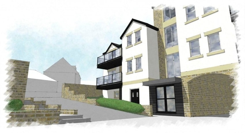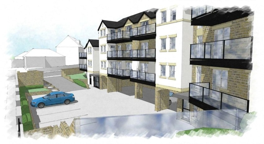 Planning permission granted for 14 apartments with undercroft parking incorporating two lifts and balconies to each flat.