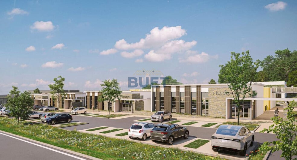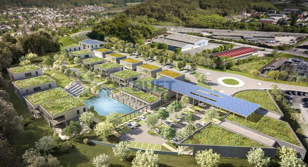 - Espaces extérieurs aménagés : l’ensemble est organisé autour d’un plan d’eau central, d’un parc paysagé et de cheminements piétons pour un cadre de travail agréable