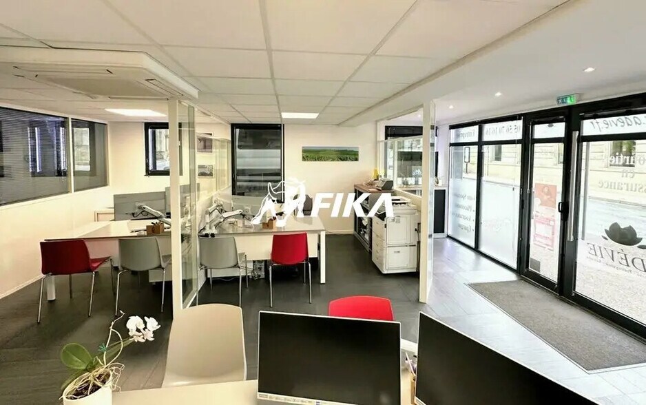 Le local est aménagé d'un accueil avec bureau, de deux espaces de bureaux semi cloisonnés, d'un bureau fermé, d'une salle de repos avec kitchenette et d'un WC.