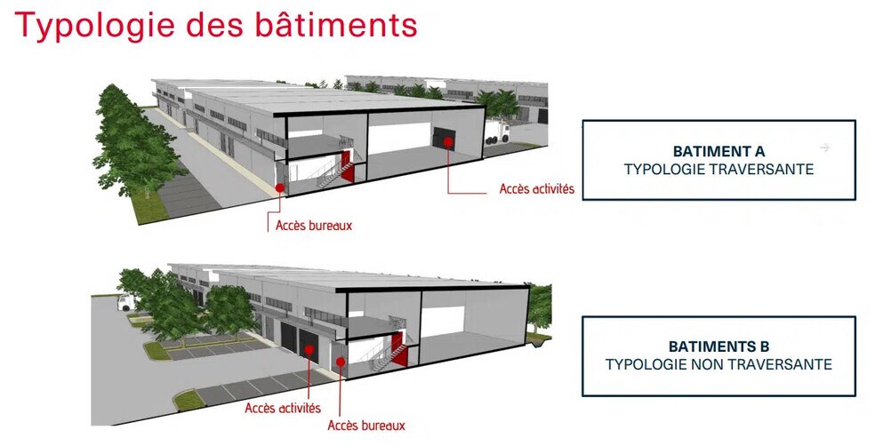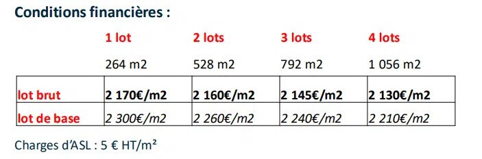MyLocaux offers 264m² units for sale located in Stains, just outside Paris. Option to combine multiple units. **Office Features:** - Open space - Suspended ceiling - LED lighting - Reception area **Activity/Industrial Features:** - Clear height under beams: 7m - 1 ground-level delivery access per unit - Floor load capacity: 3T/m² - Yellow rate 48 kVA power supply - LED lighting - Heating via gas or electric air heater (to be determined) **On-Site Amenities:** - Access for medium-sized trucks - Secured site - 3 parking spaces per unit - 24/7 access