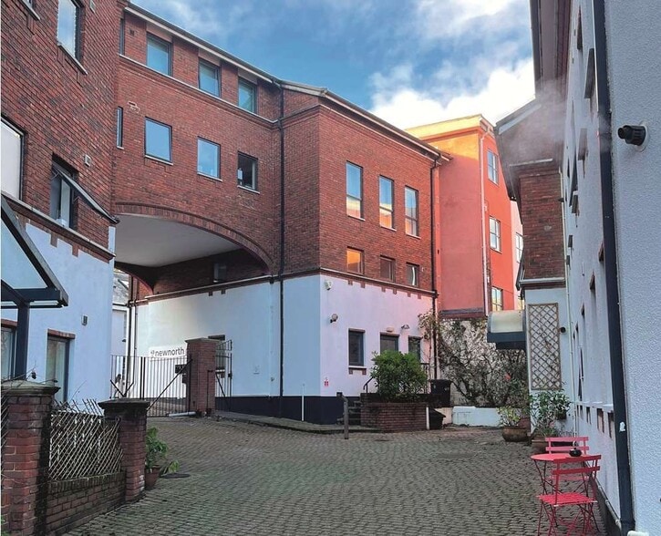 The property has roadside frontage on New North Road and Longbrook Street, with the access through a gated archway off New North Road into the courtyard.