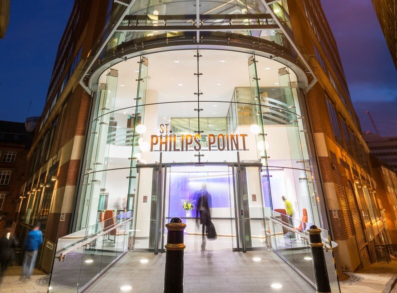 At the very heart of Birmingham overlooking the city's cathedral square, St. Philips Point has 14,208 sq ft of refurbished Grade A office space. Available for immediate occupation, it is ideal for occupiers seeking space for either B1 office or D1 training uses. The office space features exposed ceilings and contemporary touches that help to create an energised working environment for both the office workers and visitors. Quality finishes and bespoke layout make this space fit for the needs of today's modern work place occupiers. Located just minutes from the city's three principal railway stations, and with a West Midlands Metro tram stop just metres away from the front door, St. Philips Point offers effortless access to the city's top amenities together with leisure and retail locations such as the Bullring and Mailbox.