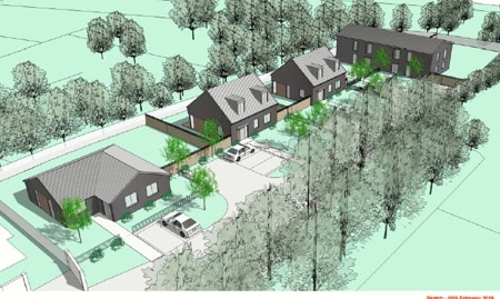 The land, which currently comprises single and two storey warehouses in B8 use, is located to the rear of Redhill Cottage within a rural village surrounded by agricultural land except to the west where there is a 2 storey residential building providing vehicular access to the subject property.