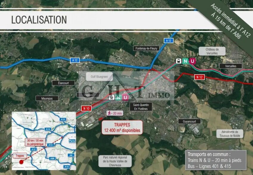 Nous avons le plaisir de vous présenter un entrepôt exceptionnellement situé à Trappes, proposé par GHT IMMO, votre partenaire en immobilier d'entreprise. Caractéristiques principales : Surface totale : 12 400 m² d'entrepôt Divisible à partir de : 2 750 m² Lot 2, 3 et 4 : 2 754 m² au total avec 2 408 m² d'activité et 346 m² de bureaux. Transports en commun : Trains N & U - 20 min à pieds Bus - Lignes 401 & 415 Rénovation totale avec disponibilité en septembre 2023 Localisation : nGHT IMMO - 01 48 93 81 23 - Plus d'informations sur www.ghtimmo.fr (réf. 940046400)