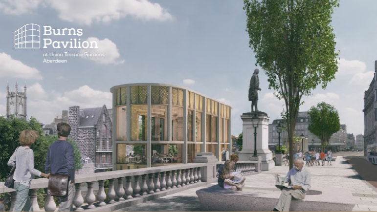 The Burns Pavilion comprises a detached two storey building of steel frame construction incorporating glazed curtain walling and sedum roof. Internally the pavilion has been finished to a high standard with Terrazzo flooring with integrated underfloor heating. An impressive 5 metre ceiling height creates a sense of space at ground floor. The ceiling has integrated lighting throughout. Toilets and storage are provided. Access to the pavilion is provided from Union Terrace and from the garden level. The pavilion incorporates a public 15 passenger lift providing accessible access to the gardens. The Burns Pavilion is located on Union Terrace adjacent to the Robert Burns statue and within close proximity to the Mercure Caledonian Hotel and Kirk view Café and Bistro.