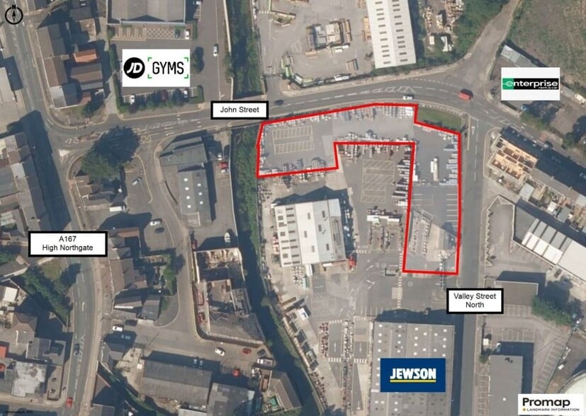 A secure fenced site of approximately 0.7 acres. The site is broadly level and separated from the remaining Jewson site by a low retailing wall. The site is surfaced with tarmacadam and concrete. The electric transformer serving the Jewson depot is adjacent to the site entrance, giving potential for an electrical connection. The property is located on Valley Street North on the northern fringe of Darlington town centre. The site also fronts John Street and with access off the A167 High Northgate. The A1(M) J58 is 3 miles to the west and the A66 is 2.4 miles to the east, which links Darlington to Stockton and Middlesbrough. Darlington’s LNER train station is approximately 1 mile south of the site.