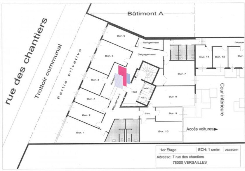AP CONSEIL offers a 516m2 office space for rent. Located at Versailles Chantiers. The common areas and elevators were renovated in 2022. The space includes 12 underground parking spaces. Feel free to contact us to schedule a visit. - Lease type: Commercial - Duration: 3/6/9 years - Notice period: 6 months - Tax: VAT - Index: ILAT - Indexation: Annual - Security deposit: 3 months - Rent and charges: Quarterly and in advance - Elevator - Keypad entry - Intercom - Number of underground parking spaces: 12 - Perimeter baseboards - Private restrooms