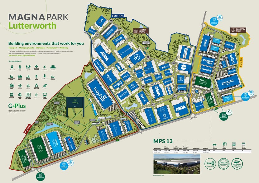 MPS 13 is one of the two final development plots available on Magna Park South, which has seen over 3m sq ft delivered over the last 4 years. MPS 12 and MPS 13 are available on a Build to Suit basis, subject to planning and will be accessed off Beaufort Blvd and the Coventry Road. This expansive 286,759 sq ft facility not only boasts a premium specification, including a generous 50-metre service yard, exceptional 15m clear internal height, 28 dock doors, and a refined two-story office space, it also champions environmental stewardship through integrated energy-saving features that minimise carbon footprint and operational costs. MPS 13 is fully primed for solar power integration and adheres to WELLness principles, creating an environment that nurtures the well-being and productivity of your employees.